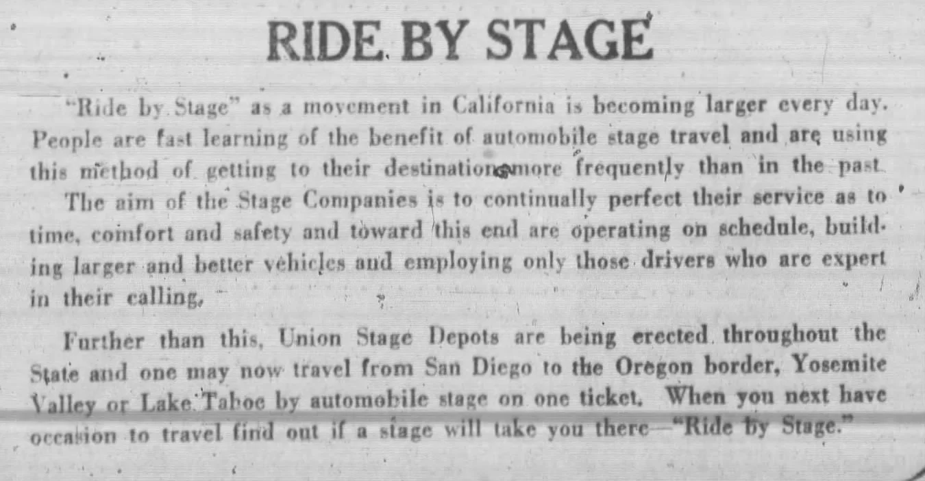 Also attached is an article about the construction of the building from April 2 1926, as well as a blurb from an advertisement that describes what riding by stage means (Feb 1, 1920).